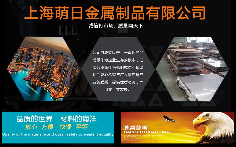 上海萌日金屬制品有限公司一直致力于為國內(nèi)各大中型國有企業(yè),外資企業(yè),民營獨資企業(yè),模具制造企業(yè),機械加工企業(yè),石油化工企業(yè)及器械企業(yè)等供應各種特種鋼材,進口/國產(chǎn)鋁合金,不銹鋼,合金結(jié)構(gòu)鋼,42CrMo鋼板,35CrMo鋼板,40Cr鋼板,合金圓鋼,中厚板,鍛件,法蘭,鋼帶,軸承鋼,易切鋼,不銹圓鋼,合金管,矩形鋁管,無縫鋁管,鋁管,工業(yè)鋁管進口及國產(chǎn)方胚/鋼錠/鋁錠,應用于機械,機電,造船,工程,煤礦,紡織,電力,鍋爐, 汽車工業(yè)等各個領(lǐng)域。我公司可以根據(jù)客戶對特殊材料的要求進行材料和產(chǎn)品的定制,可按ISO,ANSI,JIS,DIN,GB等標準定制,我們將本著"誠實守信,合作共贏,長期合作"的理念與新老客戶一起進步發(fā)展。